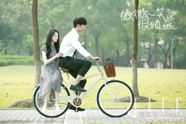 最经典的单车照!微微是之前提过的雪纺衬衫配印花短打,肖奈白衬衣黑西裤,杨洋和郑爽版的微微肖奈属于初恋系的装扮,清新感高颜值CP无误。