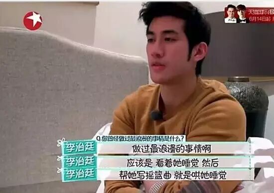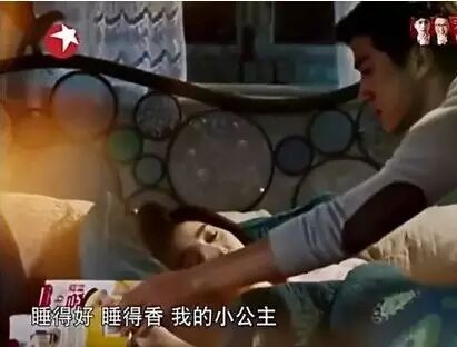 他说曾经就是看着她睡觉,然后他在旁边为她写了首摇篮曲,然后他还在节目里唱了出来,画面又切换到一夜惊喜里面他跟范的类似场景。