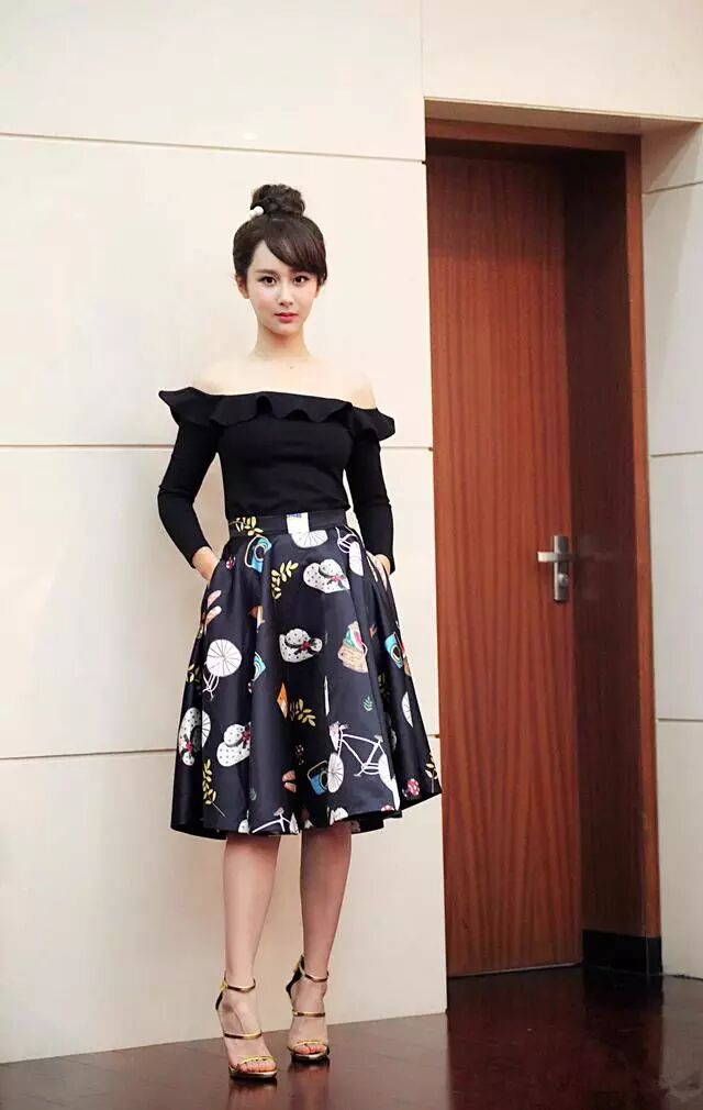 一字肩上衣,黑色荷叶边的设计淑女甜美,搭配印花半身裙,露出香肩十分性感,脚踩金色高跟鞋,轻熟多了一丝女人味。