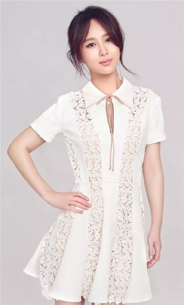 穿一袭白色镂空连衣裙,衬衫领的设计,优雅显气质,整体小清新范十足。