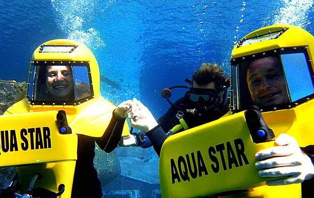 海底摩托车是一项最新的海底游乐项目,这种新奇玩意是潜水服和摩托的混合体,氧气罐就安置在摩托车的前方,不断向上面的那个类似于圆形金鱼缸的氧气面罩提供空气。人只要骑在摩托车坐椅上,扣上安全带,把头伸入连着可供压缩空气的头罩,就可以骑着这种摩托沉入海底,在海底像鱼儿一样畅游了。