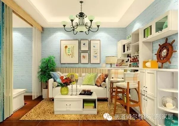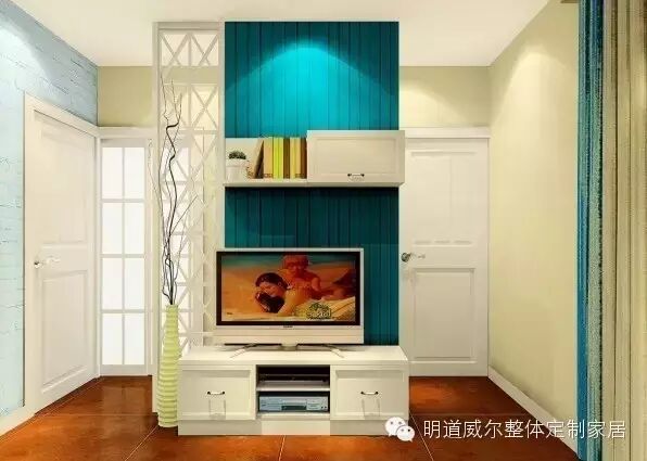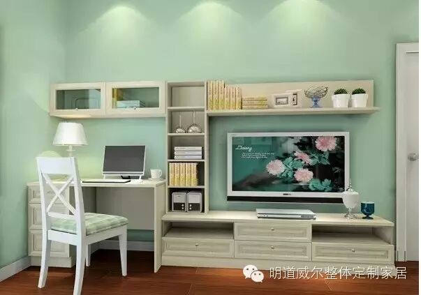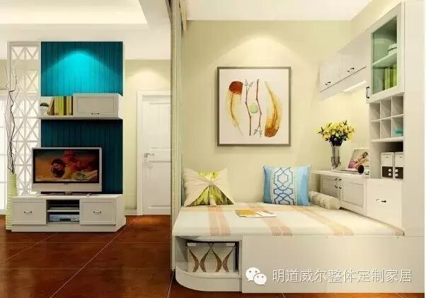 ▲无多余墙面,电视柜简单采用“吊柜+矮柜”的组合方式,也不失美观性~
