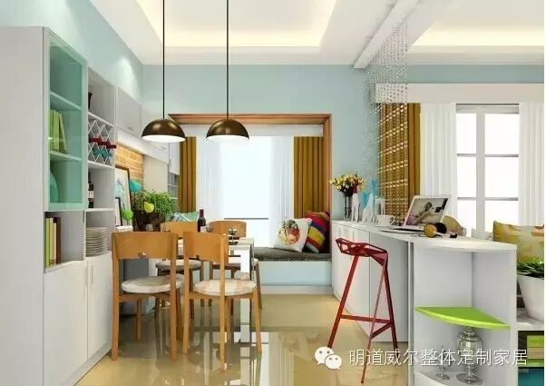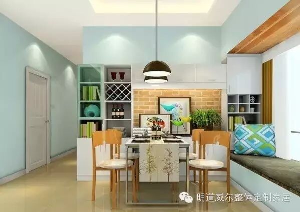 ▲利用户型特点于入门处隔出一个独立空间,当做餐厅使用。飘窗处的休闲装饰让就餐时光更惬意。