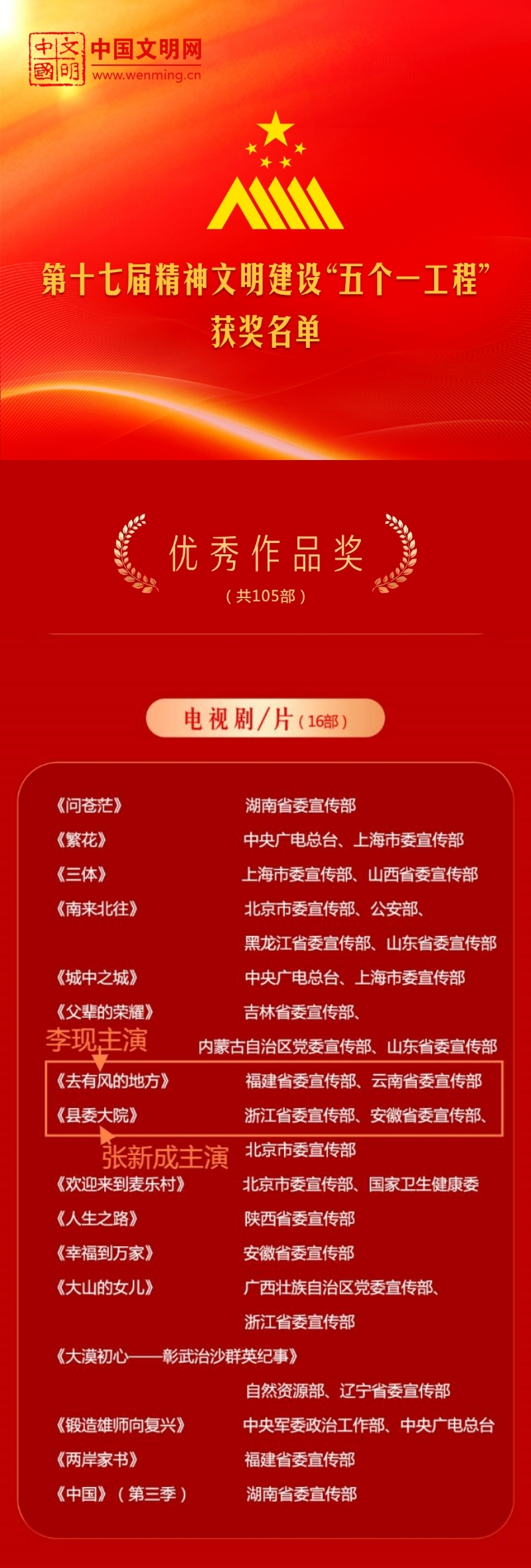 中共中央宣传部近日印发表彰决定,对第十七届精神文明建设“五个一工程”组织工作先进单位和优秀作品进行表彰。授予《齐白石》等15部戏剧作品、《流浪地球2》《人生大事》等12部电影作品、《去有风的地方》《县委大院》等16部电视作品、《陶三圆的春夏秋冬》等10部网络文艺作品、《禾下乘凉梦》等10部广播剧、《天山放歌》等12首歌曲、《习近平走进百姓家》等15部图书和《习近平经济思想在福建的孕育与实践》等15篇理论文章,共105部作品“优秀作品奖”;授予北京、河北、山西、辽宁、上海、江苏、浙江、安徽、福建、山东、河南、湖北、湖南、陕西、宁夏等15个省区市党委宣传部“组织工作奖”。(点击此链接:查阅获奖名单→)