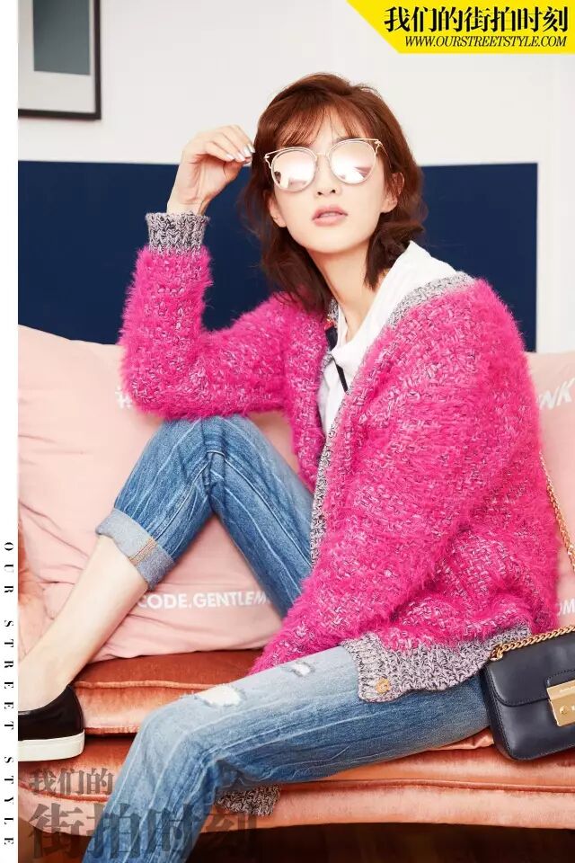 还记得她饰演《好先生》中霸道女总裁白富美江莱吗?那张红唇侧颜杀,真是美得移不开眼。枚红浅灰的开衫叠穿搭配白色内搭,给人的感觉清新又温暖。同时搭配一副Prsr帕莎T60093,改良设计的猫眼款与圆形的镜框的组合,更富有动感。