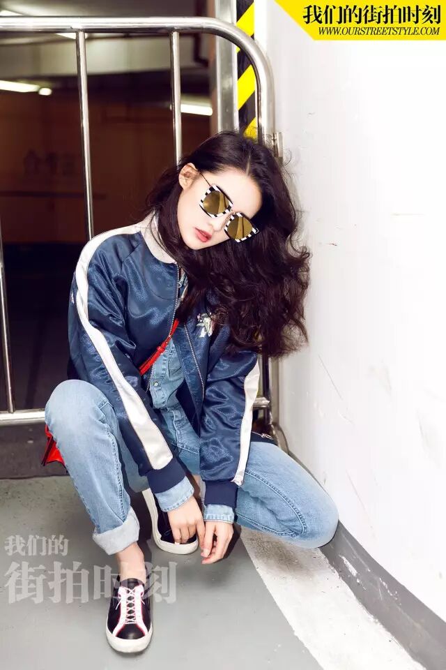 蓝白拼接的飞行员外套搭配浅蓝色的牛仔裤显得潇洒利落,拥有甜美可人外表的李沁也非常适合这样帅气的风格, Prsr帕莎B6794,独特的不规则几何形状,搭配圆形镜片,镂空的金属尖角更添灵动感,将摩登与时尚融为一体。