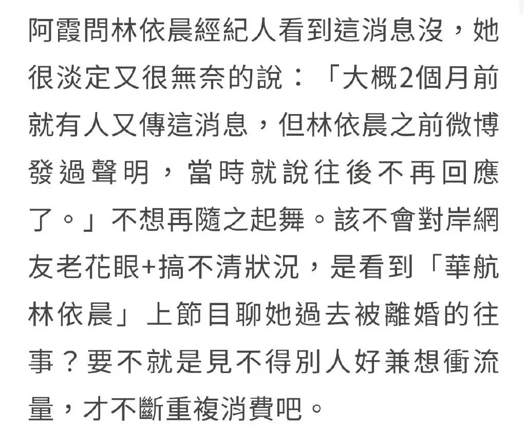 然并卵,林依晨的经纪人在内娱社交平台辟谣了, 发声称:“人家好的很呢”。