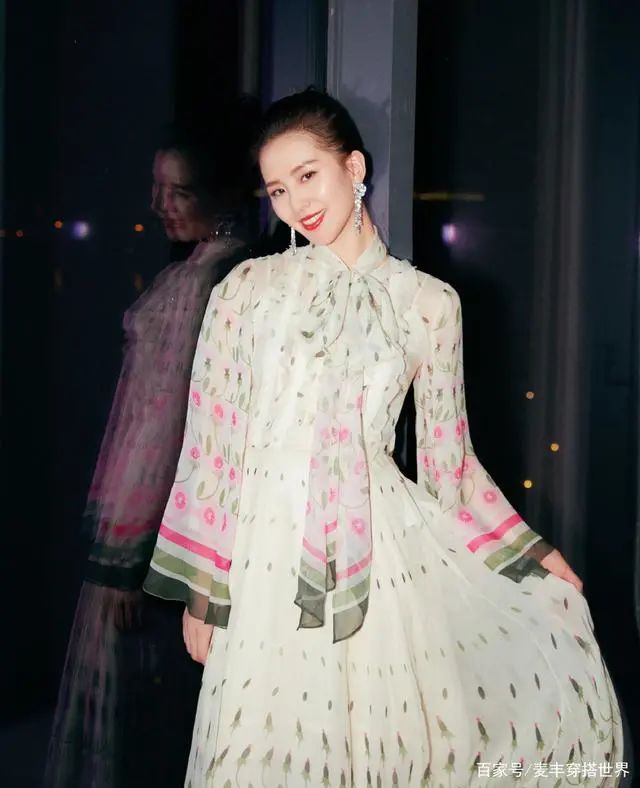 刘诗诗换上一袭薄纱连衣裙,透纱的设计,若隐若现地弥漫出性感撩人的气息,纯色系搭配彩色的印花,增添几分甜美气息。连衣裙采用系领的设计,衬托出修长的天鹅颈,撩起裙摆,显出飘逸浪漫的女人味。