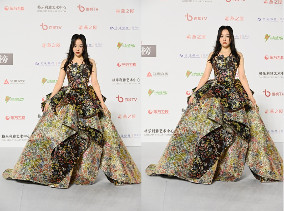 当然,也可以选择些有设计感的面料,像是类似于塑料质感的面料,挺硬、有光泽感,能很好地展现出个性气息,同时对身材的修饰效果非常明显。虽张靓颖的礼服有点看不懂,“塑料”配印花很有个性,不过挺显气场。