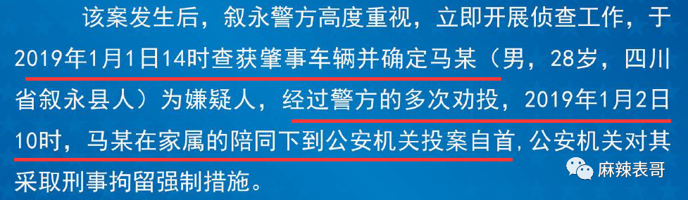 说2018年12月31日发生事故,第二天就确定了肇事车辆和嫌疑人,之后在多次劝投以后自首,并羁押嫌疑人。