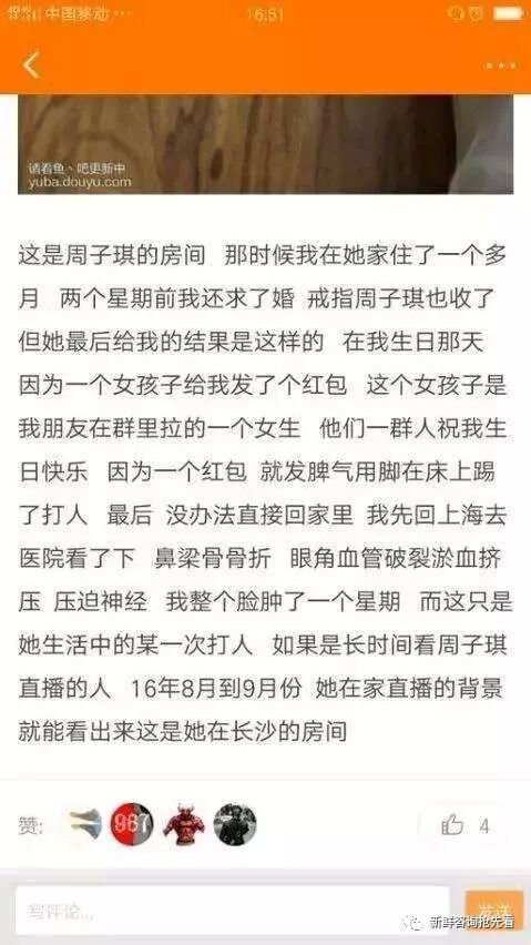 这件事情也引起了网友的关注,纷纷在直播间询问,而这个时候榜二出来说话了,表示榜一就是个傻X,后来被打的榜一忍不住了,继续在鱼吧爆料,说出了很多网友都不知道的事情,该主播原名叫周子琪,性格非常暴躁,很容易发脾气,跟镜头前的完全就是两种性格。后来又有知情人士表示这位女主播之所以会打榜一,是因为在跟榜二的”风暴哥“热恋,而且风暴哥好像还是个胖子,不少网友看后都对榜一很是心疼啊,花了这么多钱到头来还被绿了。