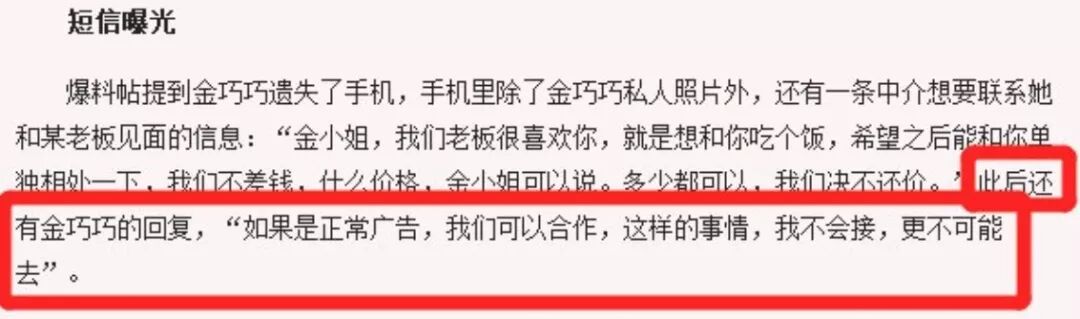 和宋祖德的狗血大战刚刚告一段落,金巧巧又成了话题中心,就是那么巧,她的手机丢了,而手机中恰好有一条富商约饭局的短信,短信内容也是相当劲爆,被媒体曝光。