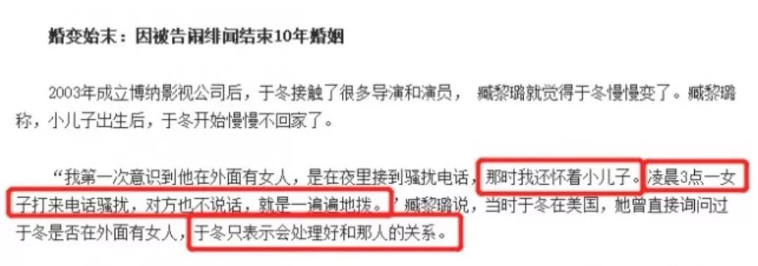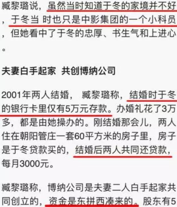 于冬的前妻叫臧黎璐,家境不错,当时臧黎璐的爸爸是南京电影公司的发行经理,而于冬只是一个小科员。于冬也是靠着老丈人的提携,一步一步有了人脉有了资源,自己开了公司。
