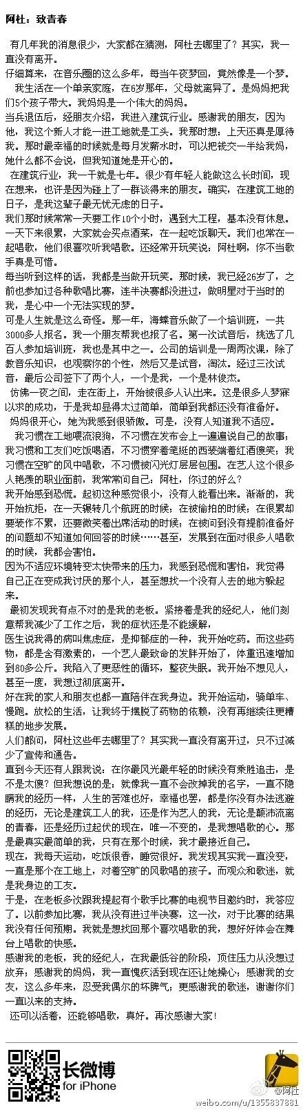 燃鹅,沉寂三年阿杜携着新专辑回归,原以为就这样全面复出,结果没多久再次淡出,2013年再次复出参加电视台的唱歌比赛节目时,才发长微博《致青春》,回忆自己的出处和恐慌。