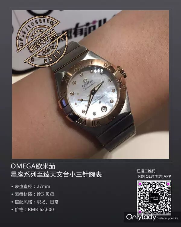 推荐理由:这款欧米茄星座系列表款,从设计方面来说,在表盘上融入了小三针设计;除此之外,这款女士腕表也是品牌首款具有双重认证的表款,使得腕表的走时更加精准。27mm的表盘对于女生来说,小巧精致,佩戴在腕间分外别致。