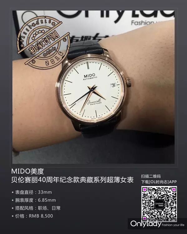 推荐理由:今年正值品牌经典的贝伦赛丽系列40周年之际,美度推出了这款超薄女表。搭载的全新机芯是在之前的基础上更新换代,厚度仅为6.85mm;皮质表带搭配玫瑰金表壳经典而简约。预计在今年的4、5月份就会上市。