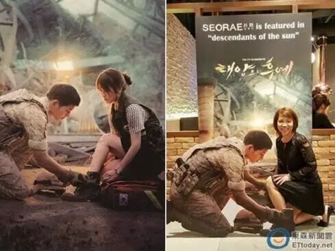 最近,新加坡一家韩式烤肉店便把这样的画面做成立式广告牌,让女性顾客可以假装自己是宋慧乔,过过“被柳大尉绑鞋带”的瘾。