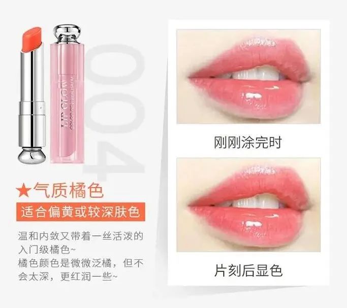 颜色是橘色,上唇后是淡淡的珊瑚色,相比001的浅粉更元气鲜艳一点,