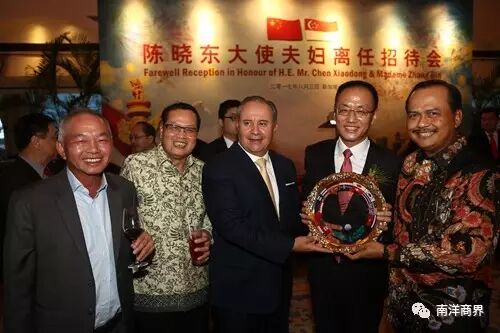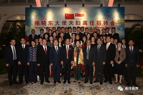 据外交部消息,8月3日,陈晓东大使和夫人张斌在新加坡富丽敦海湾酒店举行离任招待会。新加坡外交部副常秘黄德贤、总检察长黄鲁胜等政府代表、李奕贤等国会议员、李文献等前政要、中华总商会会长黄山忠、工商联合总会主席张松声、宗乡会馆联合总会会长蔡天宝、中国商会会长胡进胜、新中友协会长潘国驹等华社、工商、科教文、军警各界代表及驻新外交使团和中资机构等代表共400余人出席。