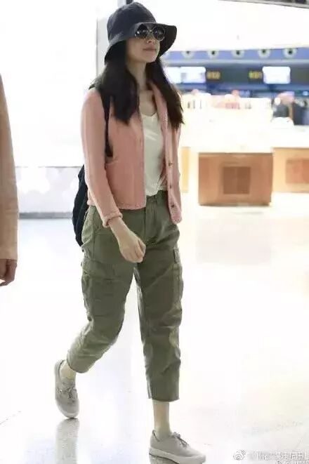 倪妮搭配军绿色裤子,露出纤细的脚踝。