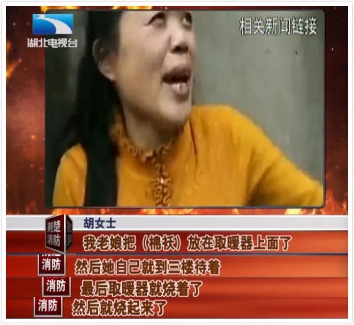 2014年1月29日,发生在安徽池州的一起民房火灾,就是由于居民在电暖器上烘烤衣物引起的。火势顺势从二楼往三楼蔓延,瞬时间,整栋居民房被浓烟烈火吞噬。消防员用时20分钟,才将大火扑灭。