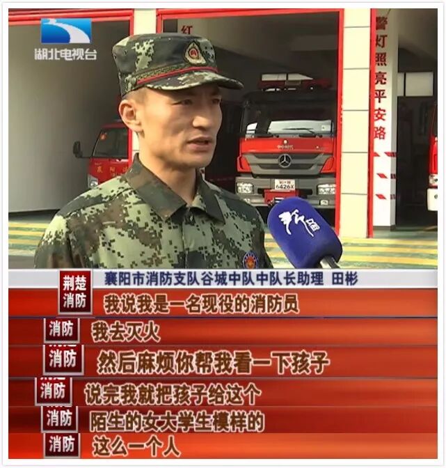去年1月22日,襄阳市一名消防员田彬在调休时,带着儿子逛商场,遇到了一场火灾,在职业本能的驱使下,他将儿子交给一群陌生人照看,毅然冲上灭火现场。田彬“托子救火”的事迹传开后,被网友亲切的称为“大爱哥”。