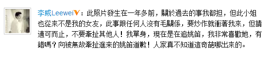 李威发文斥炒作露骨床照 承认追姚笛恳请“别牵扯她”
