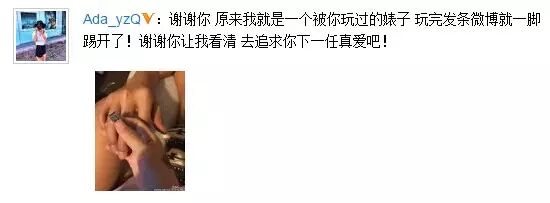 6月24日22点34分,李威前女友通过微博发声,称:“谢谢你,原来我就是一个被你玩过的婊子。玩完发条微博就一脚踢开了!谢谢你让我看清,去追求你下一任真爱吧!”并再晒出一张两人的亲密照。照片中,虽然只有一只女人的手在为另一个人剪指甲,但从照片中手的纹身和露出的花裤子看出,和之前媒体曝光的照片背景一模一样。