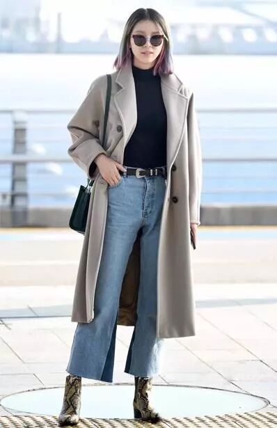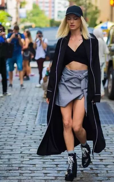 短上衣搭配起长外套,穿着半裙,秀出小腹的同时也超级拉风。