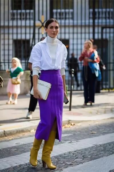 重点是在黄色靴子与紫色包臀长裙上,色彩的碰撞带来视觉焦点。