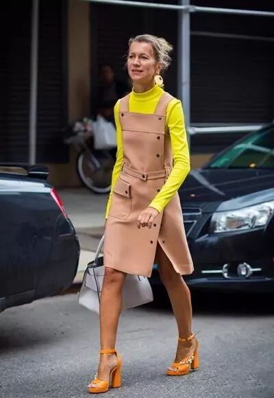 这一套乍眼一看没什么出彩的,但搭配了黄色靴子后,黄与绿的碰撞,复古风情一下子就出来了。