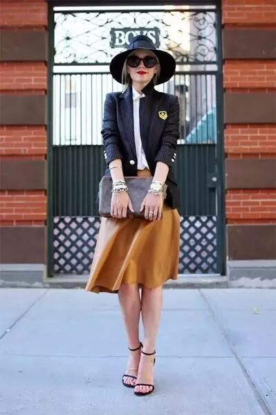 黄色半裙俏皮,搭上小西装外套后,增添了一丝优雅的味道。