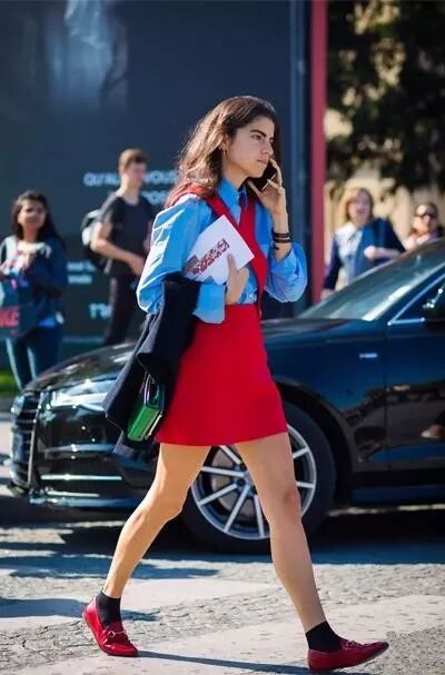 海蓝与大红,也是一组学院风Look十足的装扮。
