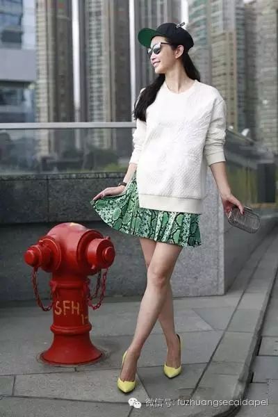 绿色的半裙搭配白色的上衣,头戴黑色的帽子,脚踩黄色的高跟鞋,也只有她才能将可爱和时尚结合的这么完美!