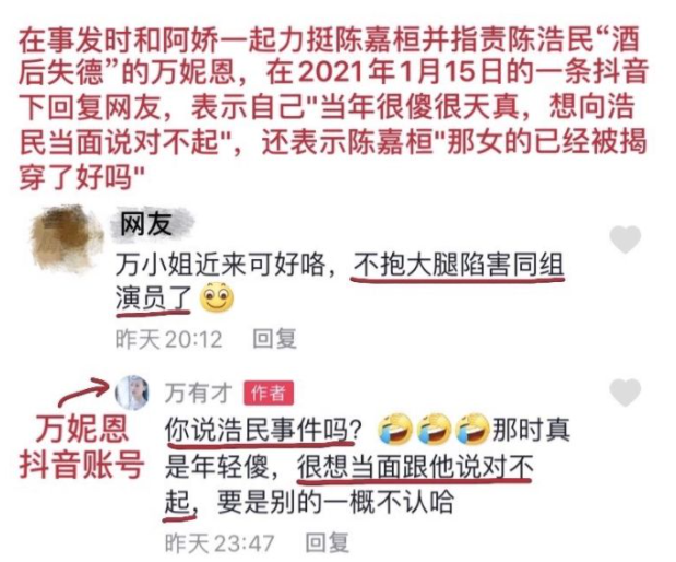 连站队指责陈浩民酒后失德的演员万妮恩,都说当时自己太傻,想要跟陈浩民道歉。