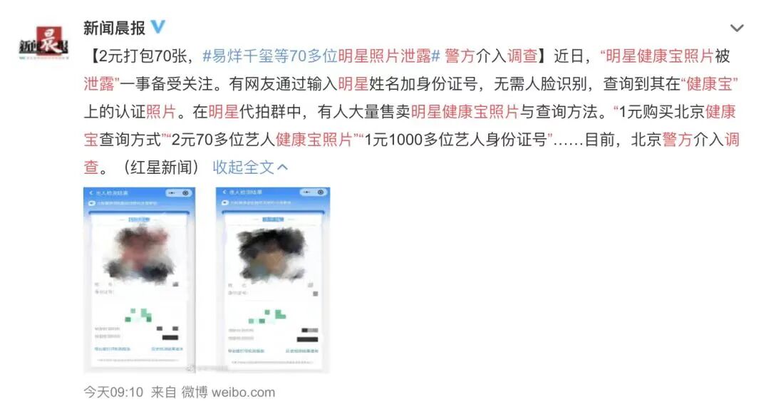 70位艺人的健康宝照片,售价2元;