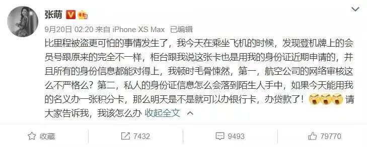 演员张萌发了一条微博宣称:坐飞机时,发现自己“被”新办了一张航空公司的积分卡。