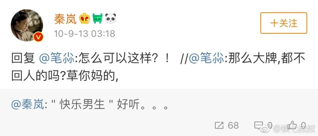 有位网友因秦岚不回复评论,气愤爆粗口,秦岚看见后,回怼一句:“怎么可以这样?!”