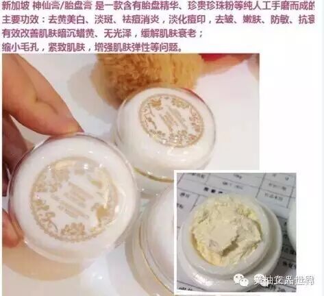 但是对于关于胎盘这么好的效果,小编实在好奇。前段时间去台湾玩,朋友送了我一款搽脸的,说是那边模特圈演艺界非常滴火,专售豪华高端美容院。看起来包装很普通,但是很特别是一个陶瓷瓶罐罐装的,对于朋友的信任就坚持用下来了,一段时间后,小编皮肤确实好了许多!再用一个月的时候就很明显了,后来就到网上搜索了下,原来这个小瓶罐含有胎盘精华,怪不得效果这么好,网络微博众多名人模特都有用并推荐,称之“神仙贵妇膏”,也叫胎盘膏。