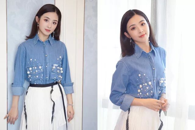 张含韵这小可爱有点婴儿肥,她很喜欢用半身裙来遮盖肉肉,她这身牛仔衬衫搭配白色半身裙,很一枚可爱~人儿