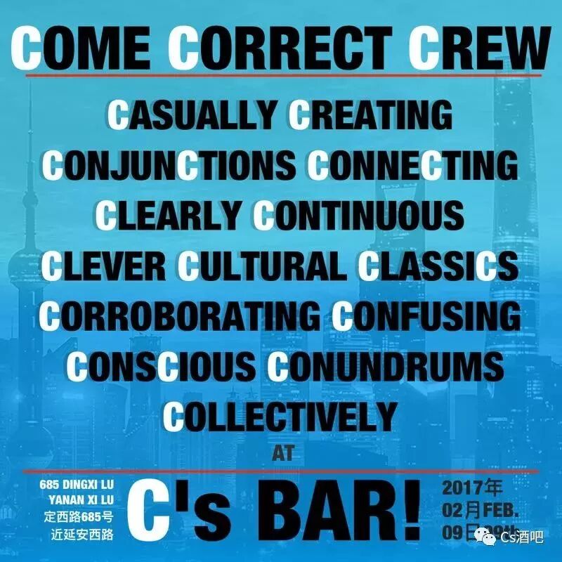 Come Correct Crew 将持续在C's bar 举行一月一次的派对!这周五整个团队将为大家带来各种风格的音乐,当然还有各种风格的Hiphop!