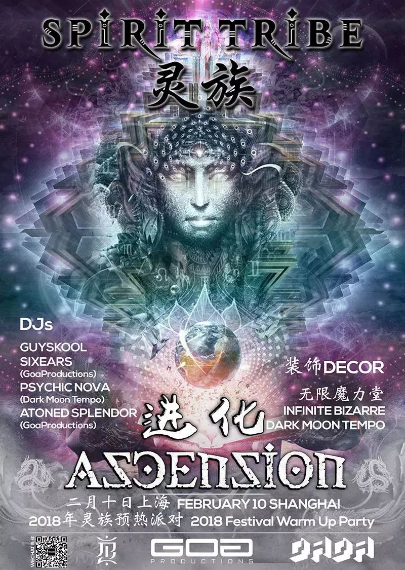 下一步我们将进化到2018年,灵族将为上海带来一个魔法与狂喜的音乐之夜! 在传奇的Dada俱乐部,你将提前感受到来自于今年4月5日-7日的第五次灵族音乐节。振奋你的灵魂,进入迷人的仙境,与上海的宇航员们一起前往进化之路。 GoaProductions的“Atoned Splendor”和“Sixears”与”Psychic Nova”和”Guyskool”一起将引导这个耳视目听的夜晚,并且由Dada通感联线。