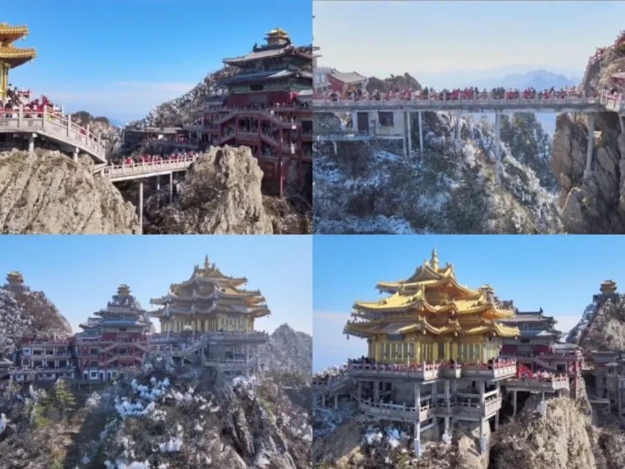 牛莉对镜头打过招呼之后,无人机就开始围绕老君山拍摄美景。山石奇峰、高楼飞檐,还有点点积雪,确是奇也美哉,难怪牛莉会忍不住与大家分享。
