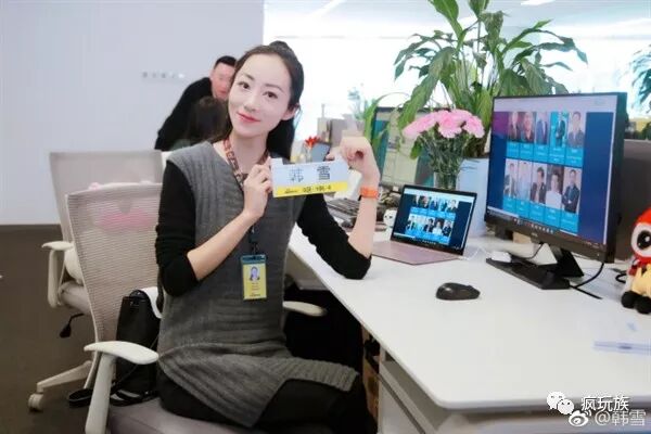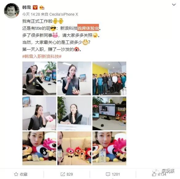 微博中,韩雪还晒出了自己和新浪同事的合影,以及自己的工位、工牌。