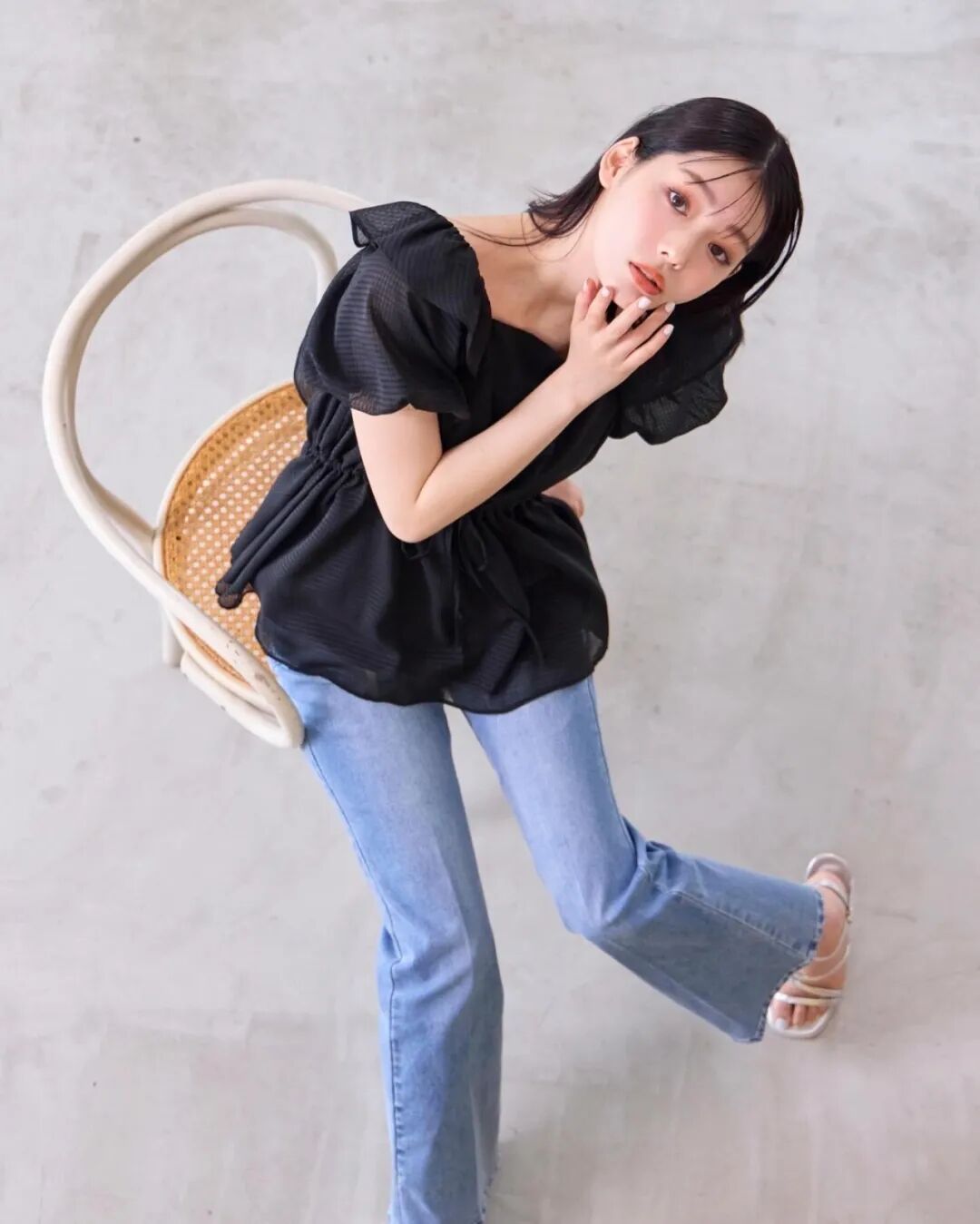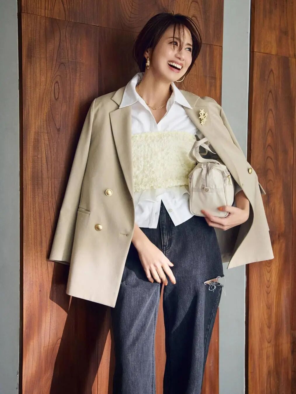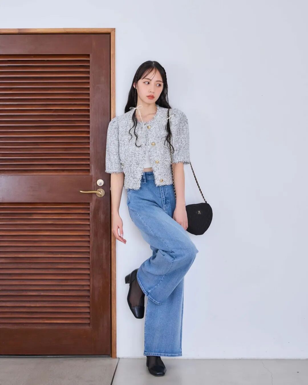 搭配 MO&CO. 的直筒牛仔裤,整体风格契合,而且能拉长线条,显得人高挑、苗条。