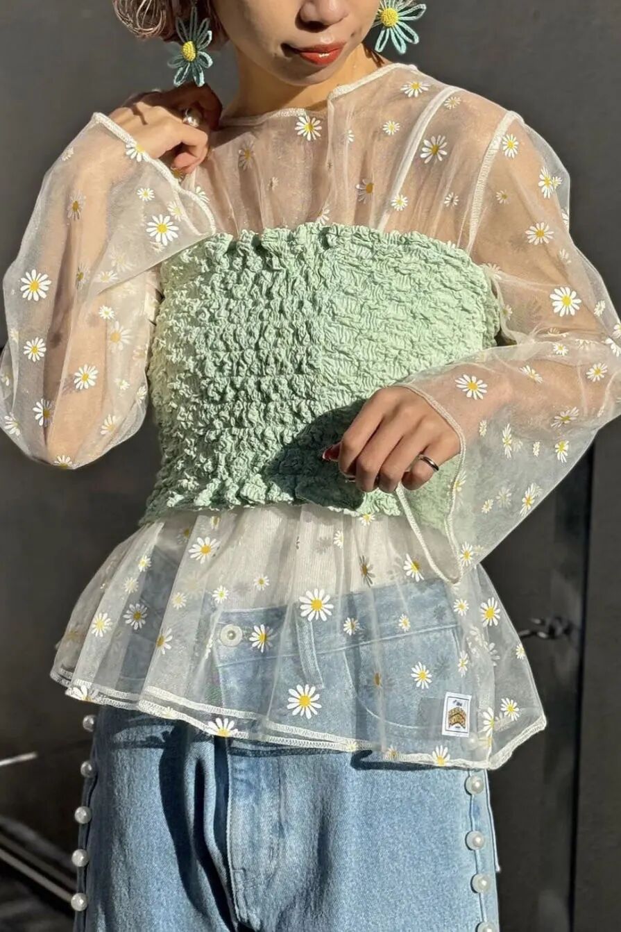 用不同印花图案拼接成美丽的花纹,灵动浪漫又嬉皮十足,周雨彤搭配牛仔裤穿,比单穿更率性、潇洒,也很符合她开朗的性格。