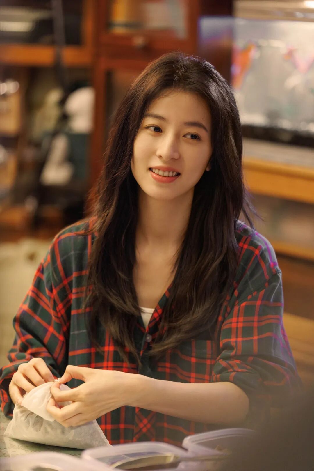 日常生活中的庄洁,则以轻松舒适的穿搭为主,宽宽大大的格子衬衫是私下最爱。