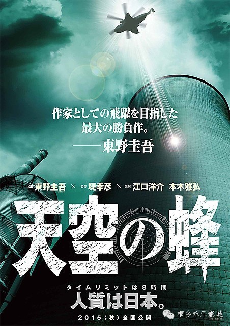 改编自东野圭吾原作,由堤幸彦执导,江口洋介将与本木雅弘首度联袂主演的电影《天空之蜂》,今日曝光了首款海报。这款预告海报还没有主角亮相,只是突出了东野圭吾这一核心卖点,将东野圭吾本人将原作视为自己作家生涯最具野心之作的评语在海报上标出。该片将于2015年秋季在日本上映。