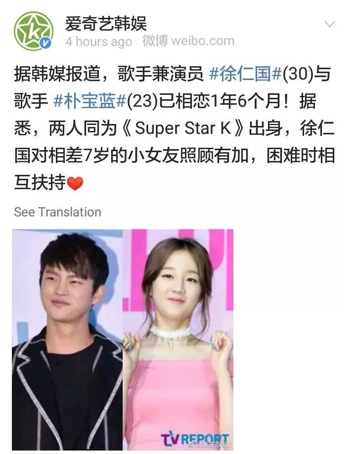 徐仁国&朴宝蓝宣布正在恋爱中!已经交往1年零6个月惹~
