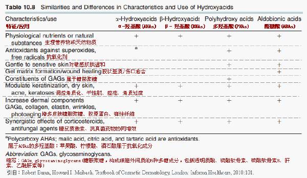 AHA(果酸:包括羟基乙酸、酒石酸、柠檬酸、乳酸等)、PHA(多羟基酸:包括葡萄酸内酯和仿乳糖酸等)都能够刺激真皮胶原蛋白与粘多糖合成。所以可以大致等同为,刺激胶原蛋白合成,弹性纤维不容易断裂的同时会把皮肤撑起来。